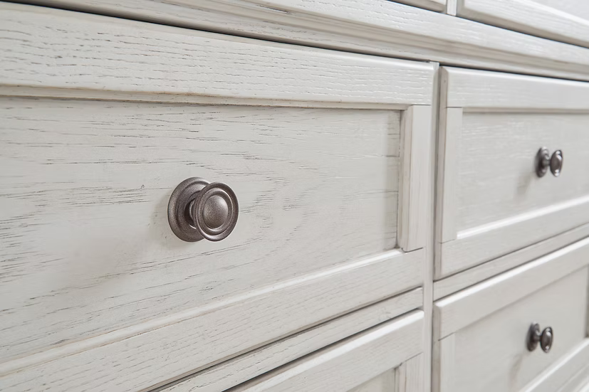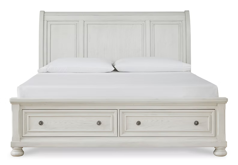 Elegant, timeless furnishings take your bedroom to the next level. Nothing does that better than this sleigh bed with storage footboard. The antiqued white finish with a wonderful grain texture radiates sophistication, while the dark bronze-tone hardware adds an ornate touch. Rounding things out, the subtle curve of the headboard keeps the look polished and poised.