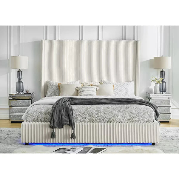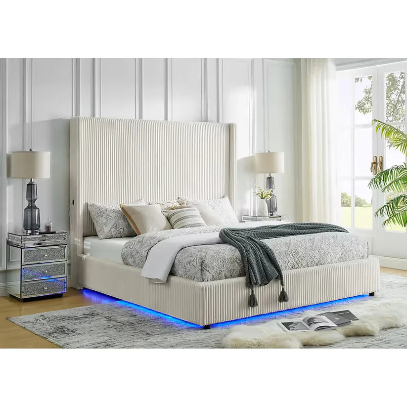 Upgrade your bedroom with the B300 Belinda Platform Bed in White, available at Texas Furniture Clearance in Conroe, TX. Upholstered in a crisp white finish, this modern platform bed combines clean style with advanced functionality. The built-in multi-color LED lighting adds a customizable glow, creating the perfect atmosphere for relaxation.