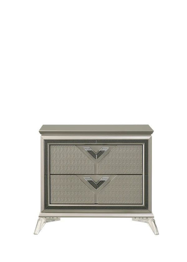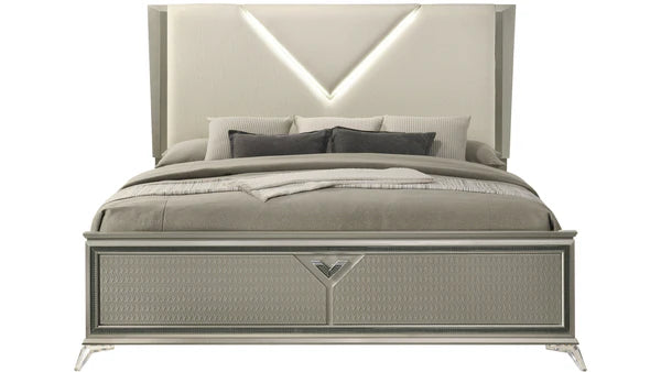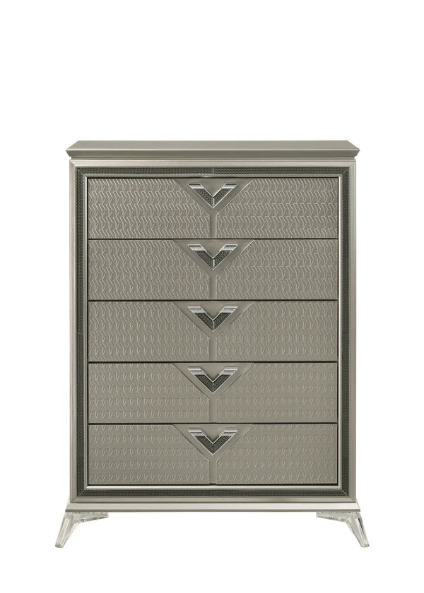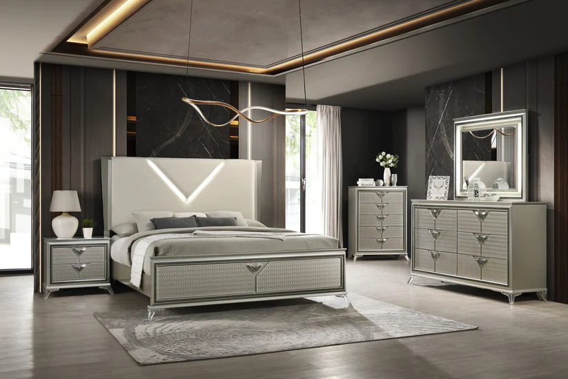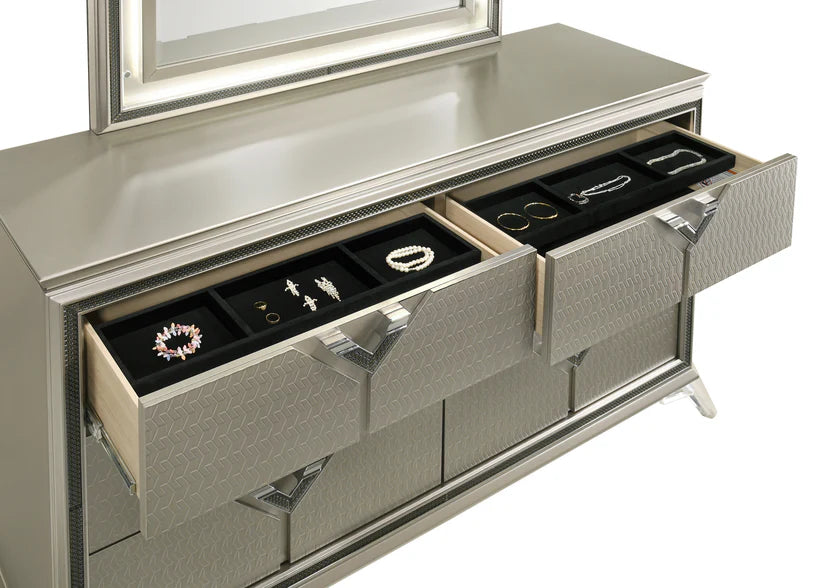 The B6850 Larana bedroom set in Olive Silver brings contemporary elegance to your space with thoughtfully designed details. Features include a striking zig-align grain embossed panel on the drawer front, a headboard and mirror enhanced with LED lighting, and acrylic bun feet paired with metal legs for sophisticated support. The upholstered grey soft fabric headboard adds comfort and style, while decorative black-silver fiberglass accents on the front frame create visual interest. Practical touches include a nightstand with USB and Type C charging ports, smooth ball bearing glides for effortless drawer operation, and an integrated jewelry box for organized storage. This set combines form and function for a bedroom that's both beautiful and livable.