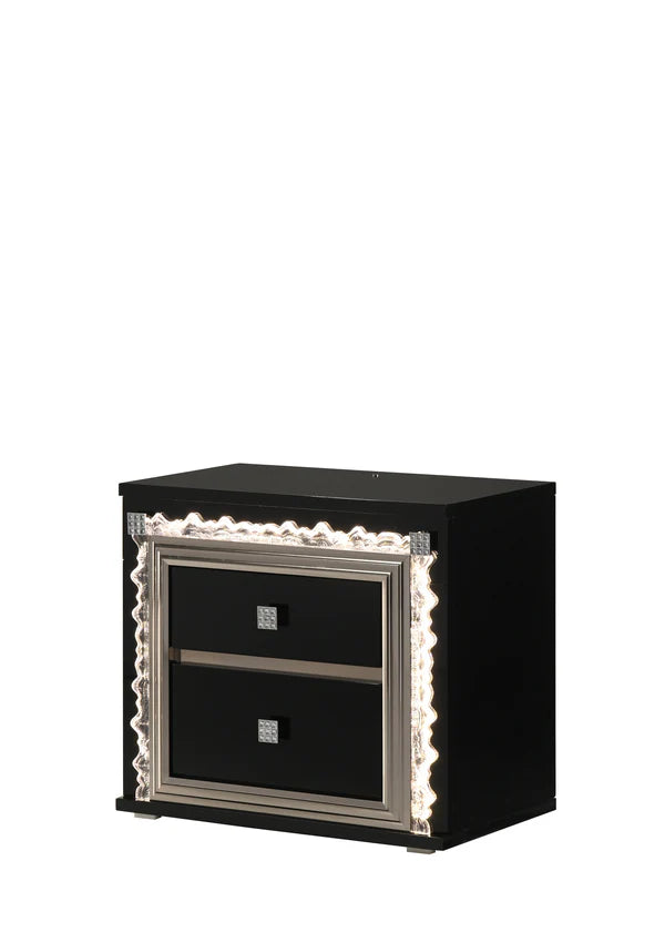 Features: Modern luxury design with bold black finish, Integrated LED lighting for ambient elegance, Marble-inspired headboard accent panel, Crystal-style trim and hardware detailing, Spacious storage with smooth-glide drawers and Complete coordinated bedroom set available.