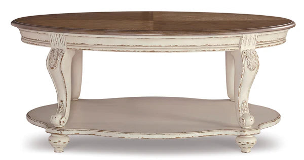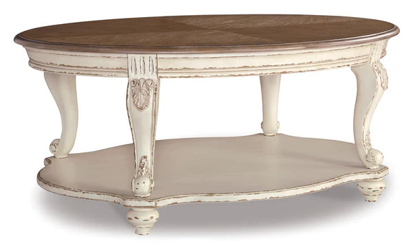 Elevating the art of traditional cottage styling, this oval coffee table is sure to serve you beautifully for years to come. Antiqued two-tone aesthetic blends a chipped white with a distressed wood finished top for added charm. Classic cabriole legs and shapely lower shelf are a lovely twist. Decorative corbels add refinement.