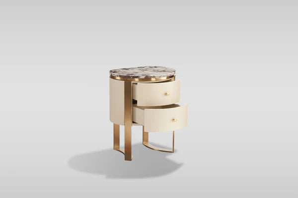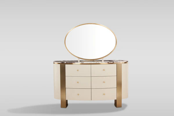 Transform your bedroom into a sophisticated sanctuary with the Corvina collection. This elegant three-piece set features a spacious dresser with six drawers, a matching nightstand with two drawers, and a brushed stainless steel mirror. Crafted with premium artificial stone tops, cream white cabinetry, and brushed gold accents, each piece combines timeless style with modern functionality. Self-closing drawer slides ensure smooth, quiet operation, while the coordinated design creates a cohesive, luxurious aesthetic. Perfect for those seeking refined elegance and practical storage solutions that elevate any bedroom décor.