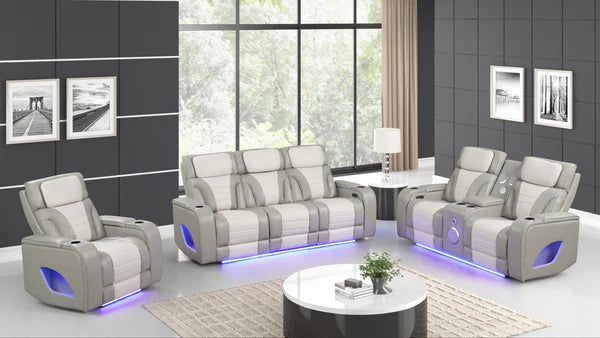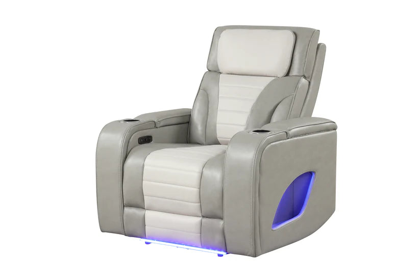 Experience ultimate comfort with the S4200 Robin collection by New Era Innovations, expertly designed in elegant grey. Built from advanced Air Leather, this premium material resists wear while maintaining superior breathability for lasting comfort. The sofa elevates entertaining with power reclining, a convenient drop-down table featuring cupholders, wireless charging, USB ports, ambient LED lighting, and a dedicated reading light—plus spacious storage arms. The loveseat delivers power reclining paired with integrated Bluetooth speakers, a functional console with cupholders, USB access, and LED ambiance. The recliner offers power reclining with USB connectivity and LED lighting. Every piece features intelligent storage arms, creating a cohesive seating solution that seamlessly blends relaxation, entertainment, and modern convenience into your home.