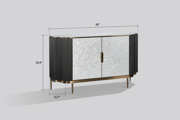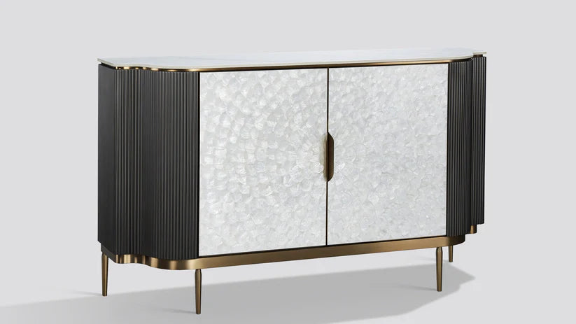 striking dark silver finish and premium materials. Featuring a sintered stone top that resists scratches and stains, brushed stainless steel accents, and natural shell inlays, this piece combines durability with refined aesthetics. The intuitive push-to-open doors eliminate visible hardware for a seamless look, while adjustable shelves adapt to your storage needs. Perfect for dining rooms, living spaces, or entryways, the Solara delivers both style and practical functionality.