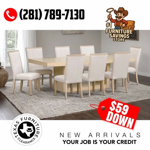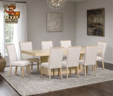 Elevate your dining experience with the D903 Dining Table + 8 Chair Set, now available at Texas Furniture Clearance, the #1 Furniture Savings Store in Texas. This stunning set features a spacious 96" x 40" x 30"H dining table paired with eight beautifully upholstered chairs in a soft sand fabric—perfect for family gatherings, dinner parties, and everyday elegance.