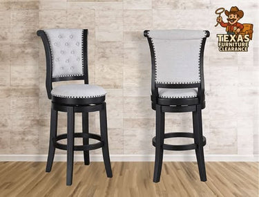 Elevate your home bar or kitchen counter with these luxurious bar-height stools, designed to bring sophistication and comfort to your space. Featuring a gracefully curved backrest with button-tufted upholstery, these stools offer a refined touch of elegance. The nailhead trim detailing enhances the upscale aesthetic, while the rich black-finished frame provides sturdy support and durability. With a smooth swivel function, these stools offer effortless movement and convenience, perfect for social gatherings or everyday use. Whether placed in a modern or traditional setting, these stunning stools blend timeless design with superior comfort for a truly stylish seating experience.