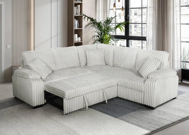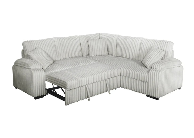 Introducing the S3662 sectional from the Neeha Collection by New Era Innovations in a stylish grey hue. Featuring a modern design crafted with soft corduroy fabric, this comfortable sectional includes a convenient pullout bed and three matching pillows, making it an ideal addition to your home for both relaxation and functionality.