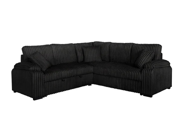 Introducing the S3662 sectional from the Neeha Collection by New Era Innovations in a stylish black hue. Featuring a modern design crafted with soft corduroy fabric, this comfortable sectional includes a convenient pullout bed and three matching pillows, making it an ideal addition to your home for both relaxation and functionality.