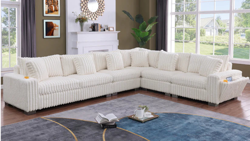 The S329 Snuggle Station transforms your living room into the ultimate entertainment hub. This cream sectional features a LAF 2-seater with stainless steel cupholder, a tech-forward console equipped with Bluetooth speakers, wireless charging, and multiple connectivity ports (AUX, USB, Type C), plus a RAF 1-seater with integrated storage, cupholder, wireless charger, USB port, and power outlet. Stay connected, charged, and comfortable all in one sophisticated piece. Perfect for movie nights, gaming sessions, or simply relaxing with everything you need within arm's reach.