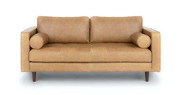 Snuggle up with your favorite pet on the loveseat version of our Nine Sofa. Built on a sturdy corner-blocked wooden frame, it's perfect for small spaces. With a comfy tufted bench seat, luxurious feather-filled back cushions, and matching round bolsters at either end, you get all the comfort of a full sized couch, but better space economy. Natural color variations, wrinkles and creases are part of the unique characteristics of full-aniline leather. It will develop a relaxed vintage look with regular use.