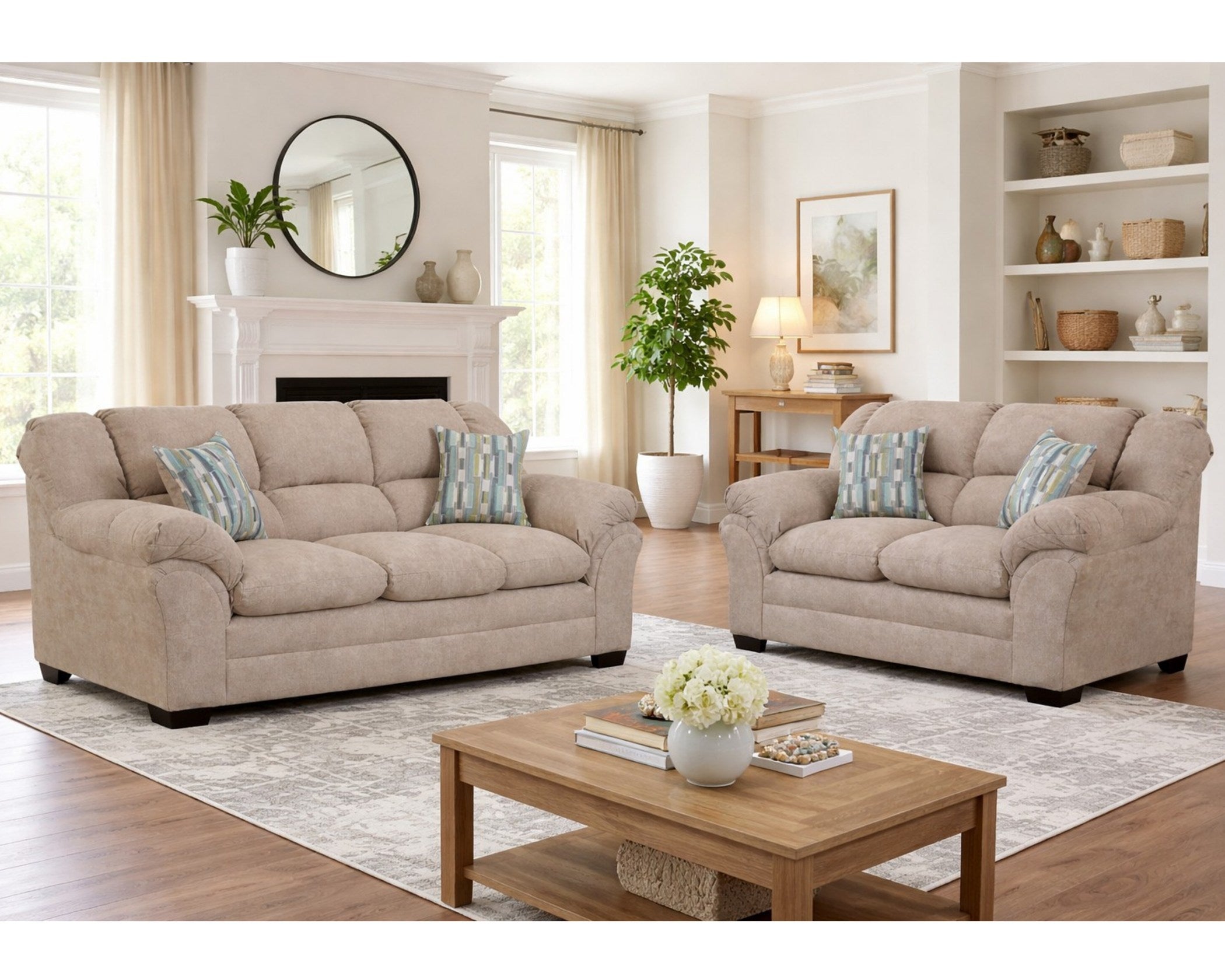Sofa and loveseat featuring plush padded arms designed for ultimate comfort. This traditional-style set showcases stylish curved arms, supportive lumbar cushioning, and includes contrasting accent pillows that add a refined decorative touch.