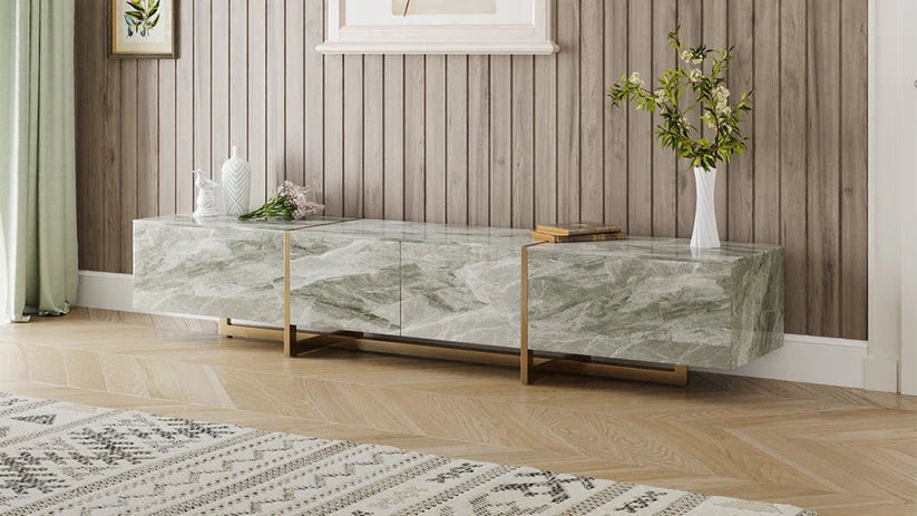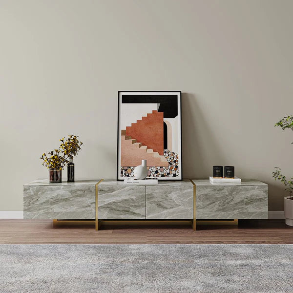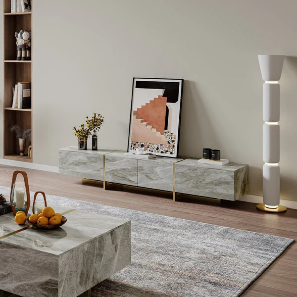 Elevate your living room with the 79" Stoney Grey TV Stand, featuring a sophisticated marble-look surface that brings natural elegance to your space. Its slim golden legs add a touch of modern refinement, making it both a functional media center and a stylish focal point. Perfect for those seeking to combine durable design with timeless beauty.