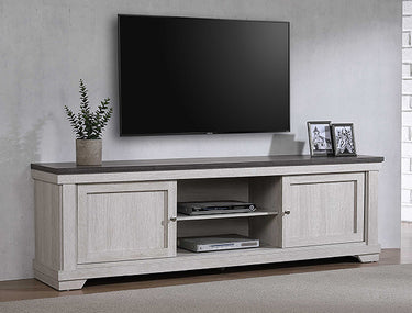 This entertainment console blends rustic charm with modern functionality, perfect for organizing your media setup in style. Its light, weathered wood finish and contrasting dark tabletop provide a striking balance of warmth and elegance. Sliding doors provide both open and hidden storage options for decor and electronics. The built-in cable management system ensures a clean, clutter-free look, while the sturdy design ensures lasting durability. Ideal for a variety of decor styles, this console is a chic and practical addition to any living space.