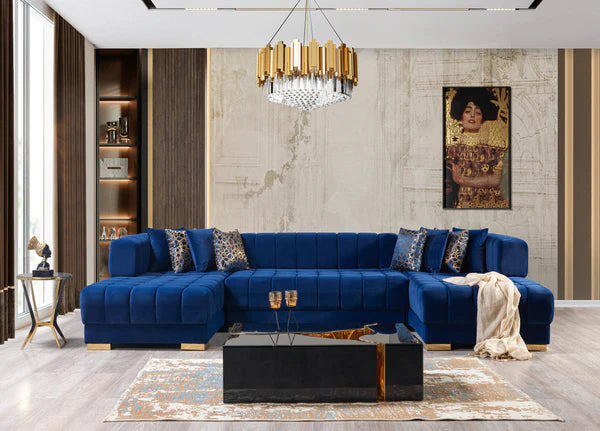 Introducing Ariana, our stunning double chaise velvet sectional, an exquisite fusion of comfort, elegance, and opulent design. The U-shape of the sectional ensures both comfort and convenience, allowing for easy and comfortable seating during large social gatherings.With its premium quality velvet fabric, not only does it provide a luxuriously smooth texture, but it also ensures exceptional durability and everlasting beauty.This stunning set includes eight comfortable pillows.