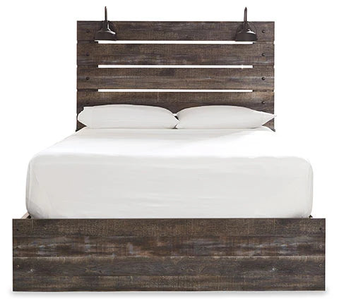 The Drystan is a refined take on barn board beauty. Its complex replicated wood grain showcases hints of burnt orange and teal tones for a sense of weatherworn authenticity. Love to read in bed. You’re sure to find the pair of retro-chic light sconces and USB plug-ins on the open-slat style headboard such a bright idea. Double drawers at the foot of the bed also come in mighty handy. The chest, nightstand and dresser’s smooth-gliding drawers lined with faux linen laminate and industrial dark-tone hardware complete this rustic and industrial style bedroom. Mattress and foundation/box spring available, sold separately.