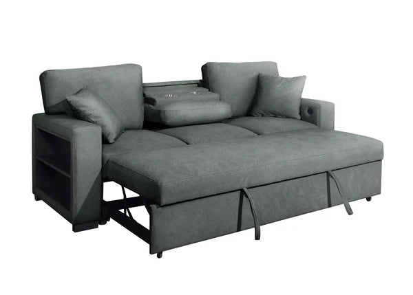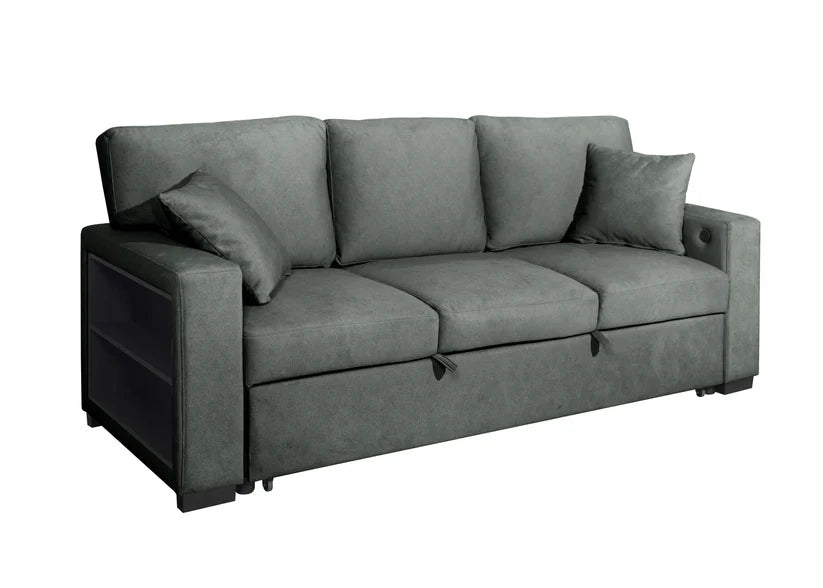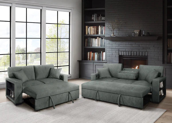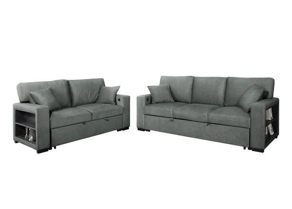 Experience modern comfort with the S3690 Bexley, a stunning grey fabric sofa and loveseat designed for today's lifestyle. Built-in bookcases on both arms provide smart storage for books, plants, or décor, while integrated USB and Type C ports keep your devices powered throughout the day. The sofa features a drop-down table with cupholders for convenient refreshments, and a hidden pull-out sleeper bed welcomes overnight guests. Wrapped in premium fabric and dressed in ordinating pillows, this thoughtfully engineered sectional transforms your living room into a hub of style, comfort, and functionality.