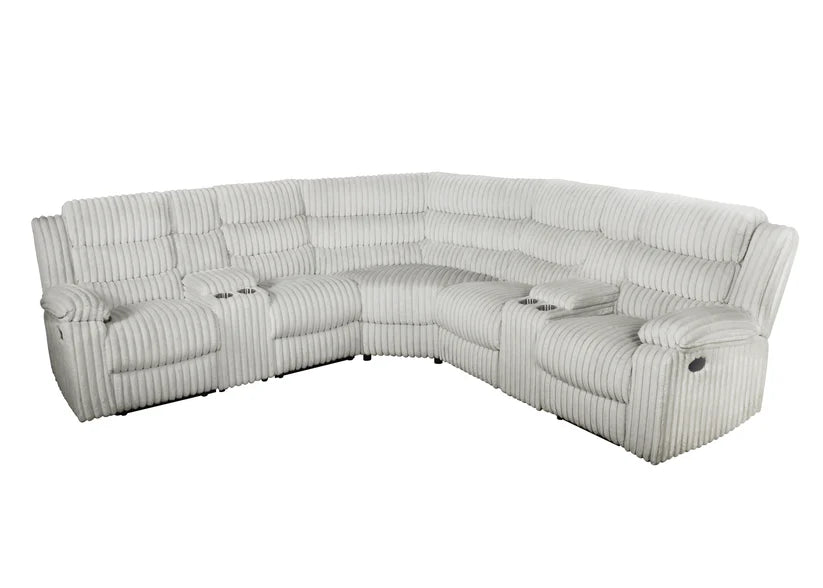 Experience the S3672 from the Calantha collection by New Era Innovations in an elegant grey color. Made with soft corduroy fabric, this stylish and comfortable piece features 2 recliners, 2 storage console with 4 stainless steel cupholders, perfect for relaxing in a modern living room. Elevate your space with both comfort and contemporary design.