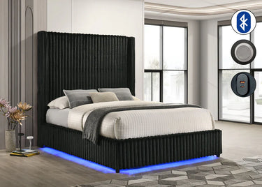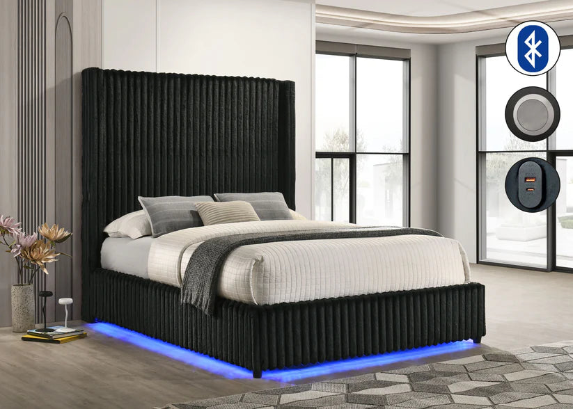 The B3001 Melinda in Black combines premium corduroy fabric with modern technology, featuring a built-in Bluetooth speaker, USB Type C charging port, and vibrant LED lights. This stylish and functional item enhances your experience with quality sound and convenient connectivity.