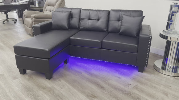 The Messi Black Vegan Leather Sectional Chaise is perfect for modern living. The PU upholstery is soft and easy to clean, while the nailhead detailing adds a touch of sophistication. The reversible chaise ensures versatile seating and USB ports allow for easy device charging. Enjoy contemporary comfort with style.