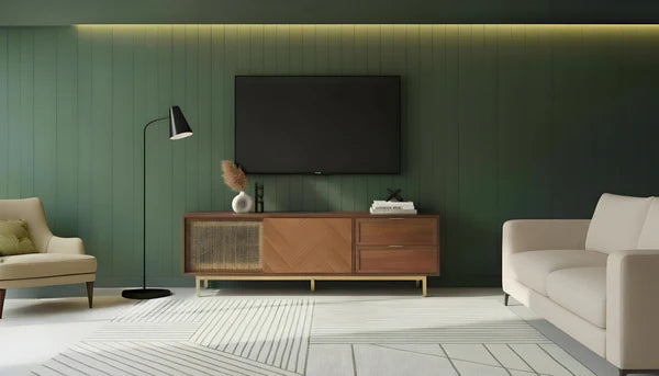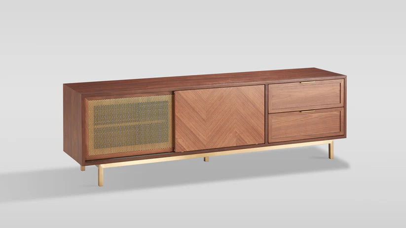 The Milana TV Console brings sophisticated storage and style to your entertainment space. Crafted with rich walnut veneer and accented by brushed stainless steel hardware, this console features two sliding doors and two self-closing drawers for seamless organization. Adjustable shelves adapt to your media equipment and décor, while a discreet wire hole with grommet on the back panel keeps cables neatly concealed. Perfect for modern living rooms seeking both functionality and refined elegance.