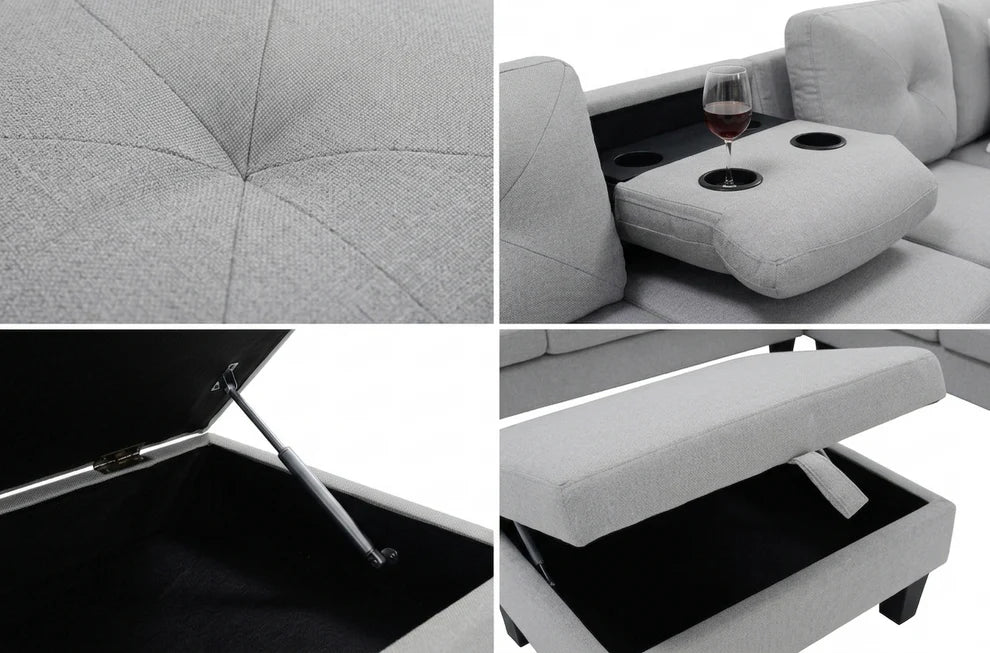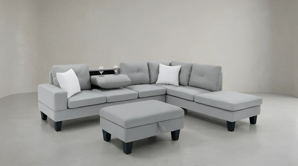 Clean, modern, and made for everyday living—the Star Sectional delivers comfort with smart features built in. Upholstered in a soft light grey fabric, this sectional includes a convenient drop-down table with cupholders and a matching storage ottoman to keep your space organized and clutter-free.